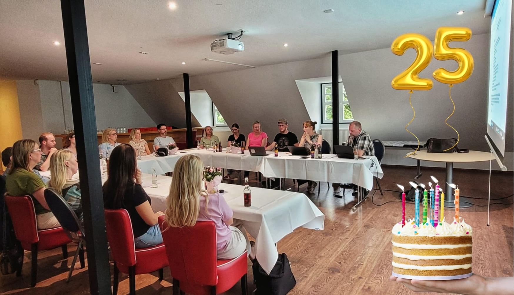 Anlässlich des 25. Jubiläums fand unsere diesjährige Mitgliederversammlung in einem etwas festlicheren Rahmen statt. Im Gulfhaus in Vechta standen Fingerfood und Getränke auf feierlich hergerichteten Tischen für alle bereit. Zuerst wurde allerdings gearbeitet und die Tagesordnung samt Vorstandswahl trotz hoher Temperaturen diszipliniert abgearbeitet.
